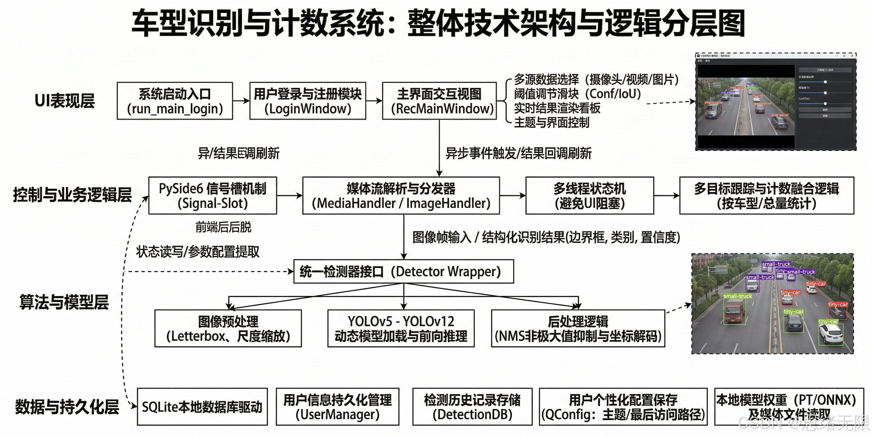 本系统面向"车型识别与计数"的桌面端落地场景,整体采用 Python 3.12 作为运行时,以 PySide6 构建交互界面并通过 Qt 信号槽组织跨模块通信,SQLite 负责用户信息、个性化配置与检测结果的持久化。设计上强调"界面交互与推理计算解耦":界面层只负责输入选择、参数配置与结果呈现,推理层封装模型加载、预处理、推理与后处理,统计层在检测结果之上完成分车型与总量计数,并与导出、回放控制等功能形成稳定闭环。