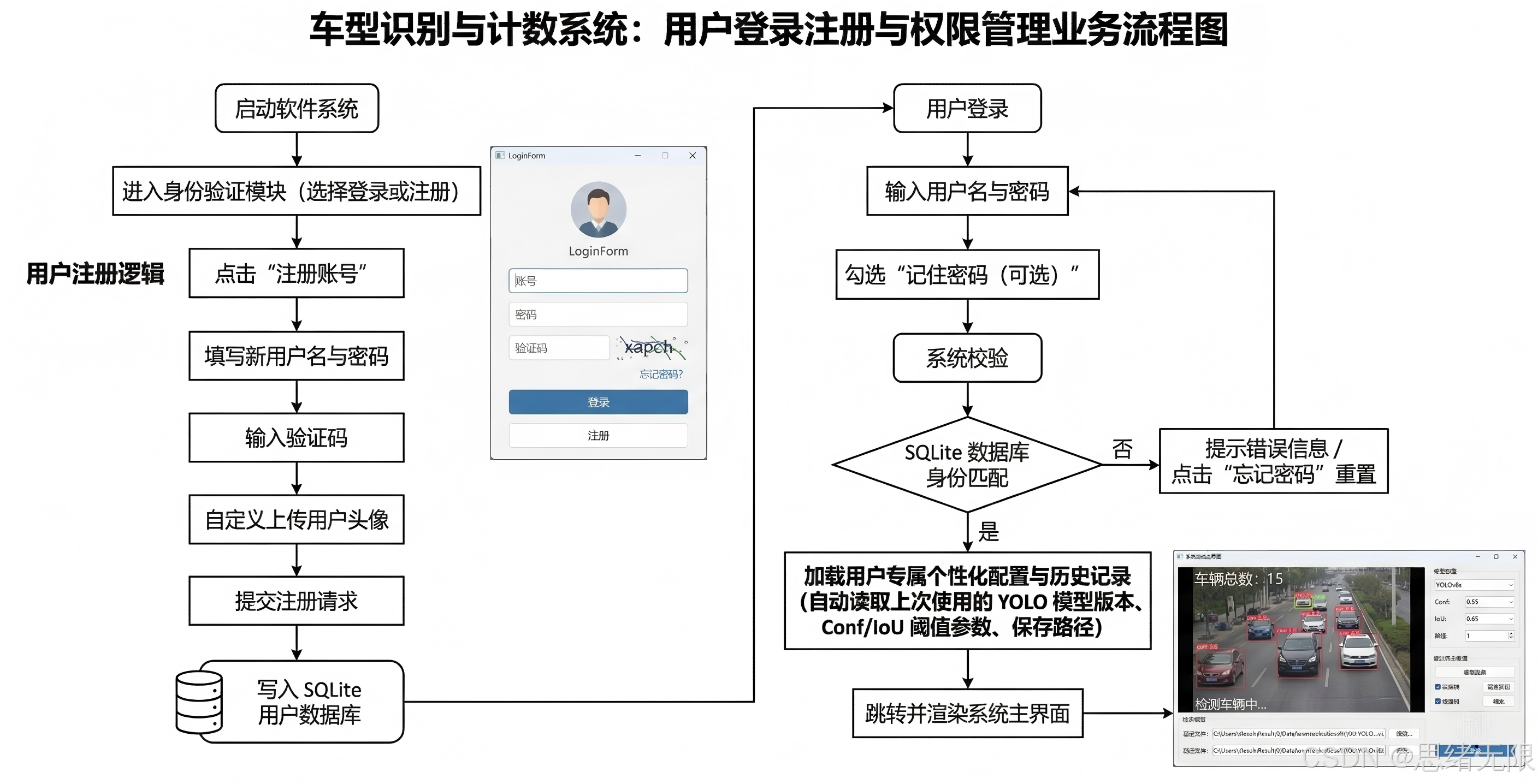 账户体系以 PySide6 的独立登录窗口作为入口,通过 SQLite 完成注册写入与登录校验,并在登录成功后加载用户级配置(如默认模型、Conf/IoU、主题外观、导出目录)与历史检测记录,使每个用户拥有彼此隔离的"参数偏好与结果空间"。该设计让主检测流程在进入主界面时即可获得稳定的初始状态,避免重复设置带来的交互成本;同时,头像与密码等资料修改会即时回写数据库并反映到界面资源与权限状态,注销/切换账号则通过清理会话与缓存将系统恢复到可验证的登录态,从而在多人共用设备的场景下保证数据持久化的一致性与可追溯性。