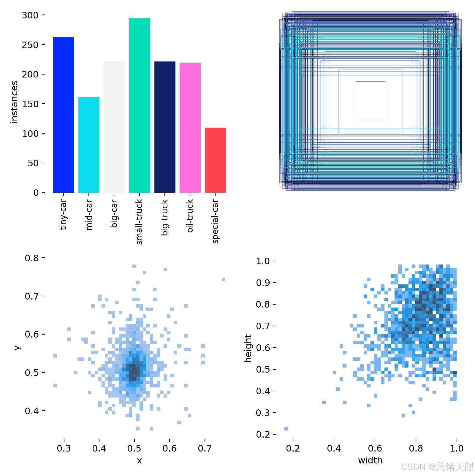 在标注与预处理方面,数据集采用 YOLO 规范的归一化边界框格式(TXT,(x, y, w, h) 均归一化到 [ 0 , 1 ] [0,1] [0,1]),并在训练阶段统一以 640×640 作为网络输入尺寸;标签统计图显示训练集存在一定类别不均衡,其中 small-truck 与 tiny-car 样本相对更多(约 294 与 262),special-car 相对较少(约 110),其余类别大致处于同一量级(约 161--221)。边界框中心点分布集中于图像中心附近、宽高分布偏大,说明样本多为"单车主目标"标注,这会降低密集车流遮挡的复杂度,但对"计数"模块的工程实现更友好,便于在推理侧将检测框与跨帧关联/过线规则进行稳定耦合,从而形成可复现的计数闭环。