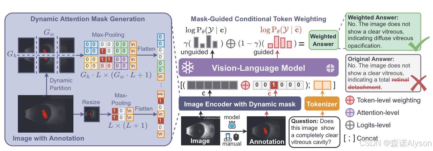 转成和图像 token 对齐的全局 + 局部掩码,告诉模型哪块是诊断关键区 - 掩码引导的三级条件加权在生成的三个层级做对比加权