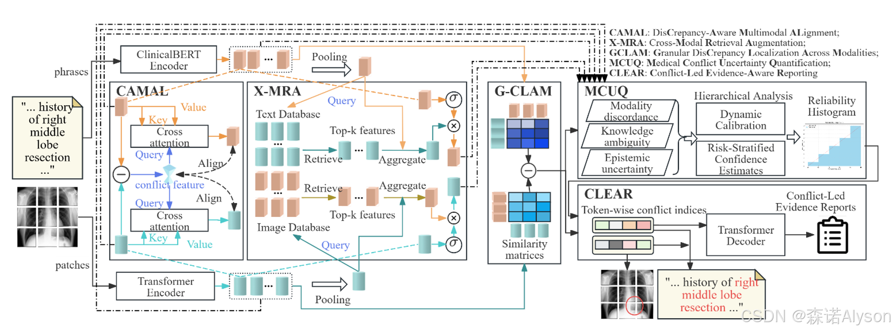 - CLEAR:矛盾引导的报告生成:解码时重点关注矛盾区域,生成带证据、可解释的报告。