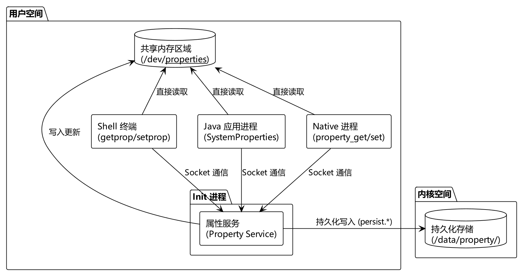| 共享内存 | 属性数据实际存储载体 | 以文件形式挂载于 /dev/__properties__,允许所有进程只读映射 |