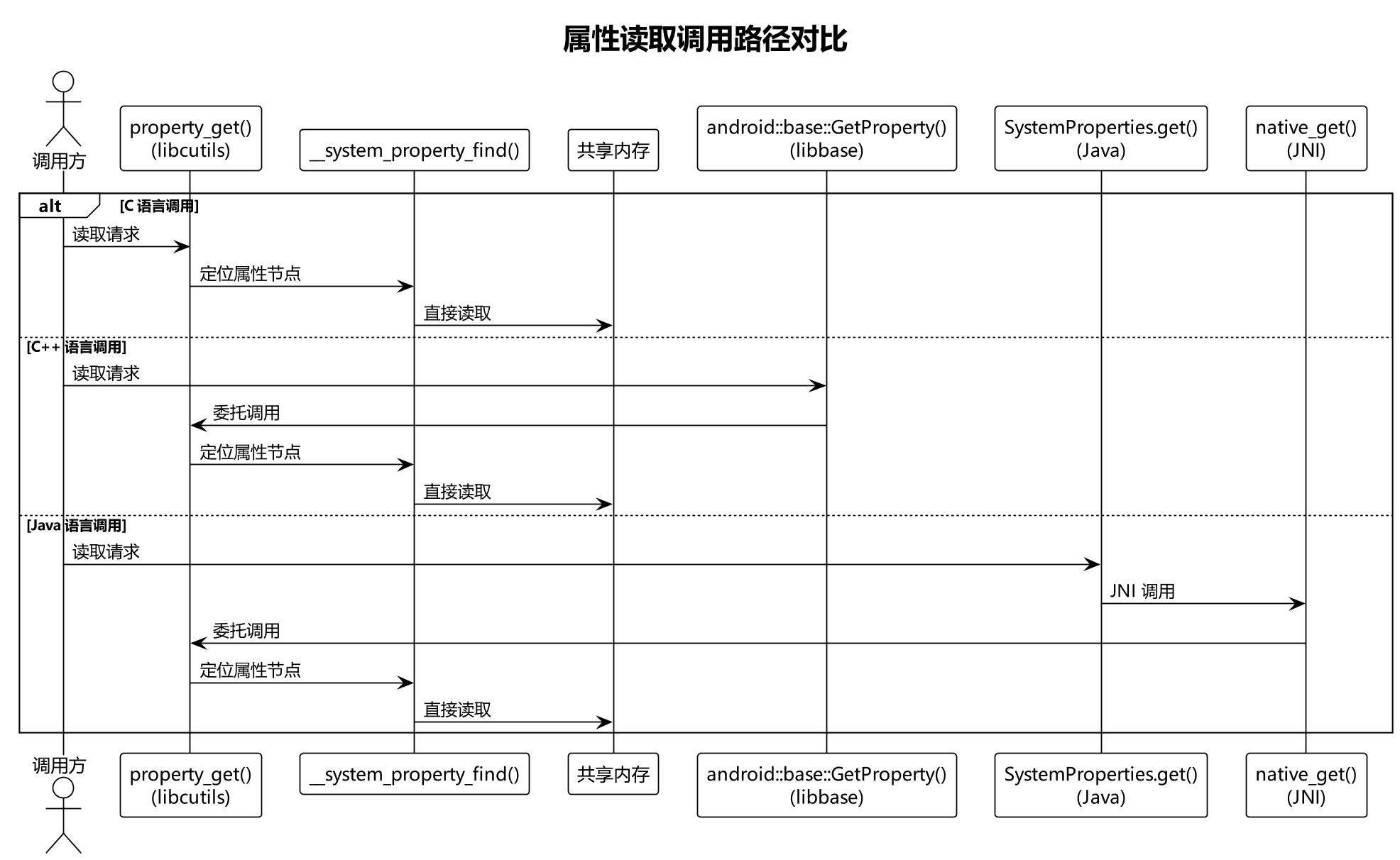 - 跨语言访问支持:Android 框架为 C/C++ 原生层、Java 框架层以及 Shell 命令行环境提供了统一的属性读写 API,确保了不同运行时环境下的行为一致性。