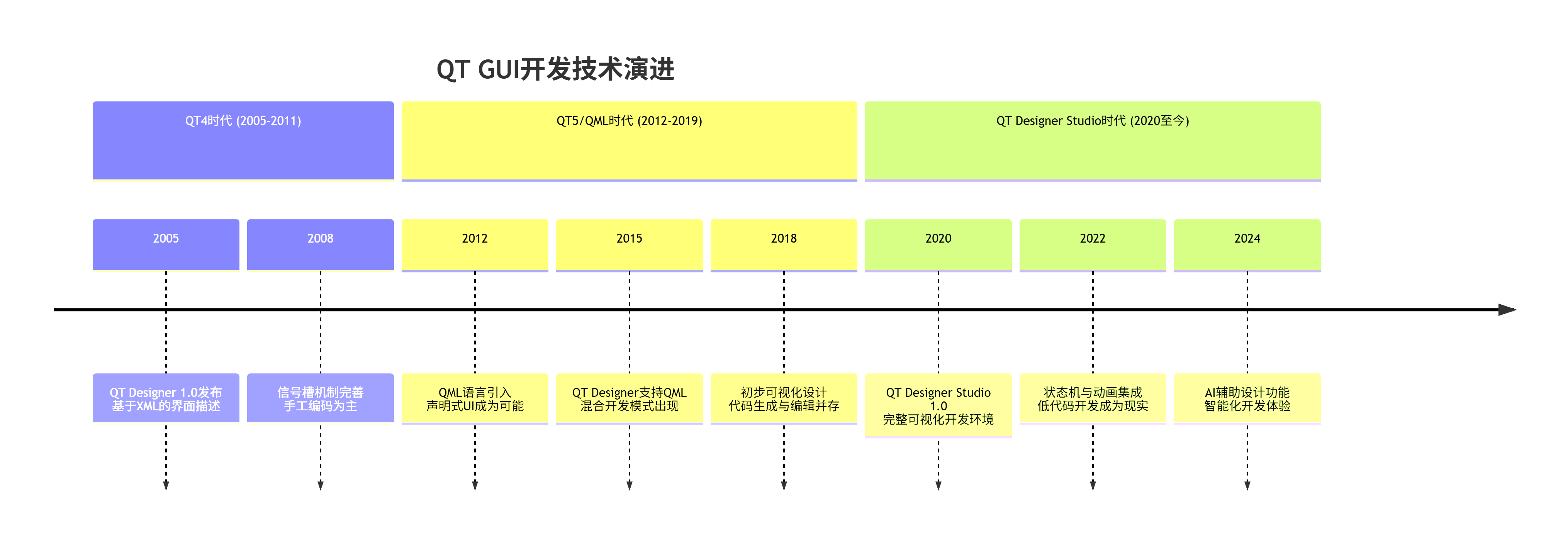 在深入了解QT Designer Studio之前,我们需要回顾QT GUI开发技术的演进历程。这个发展过程反映了软件开发理念的变化,也揭示了为什么Designer Studio代表了下一代QT开发方式。