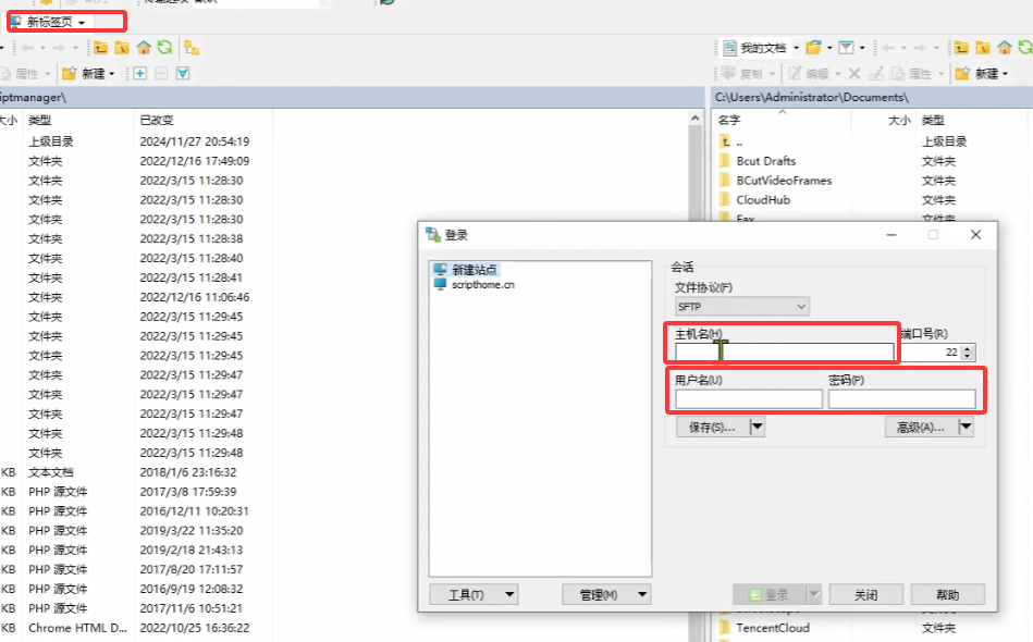 新建标签页,点击新标签页 ,在弹出的登陆界面中,输入主机名 ,用户名 和密码 ,