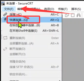 打开SecureCRTPortable,点击菜单栏上的文件 ,然后点击下拉菜单中的快速连接