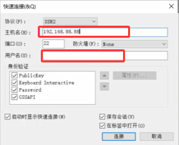 快速连接界面中录入主机名 和用户名 。这里用户名不要使用root,Ubuntu的root账号没有设置密码,不能使用root远程访问