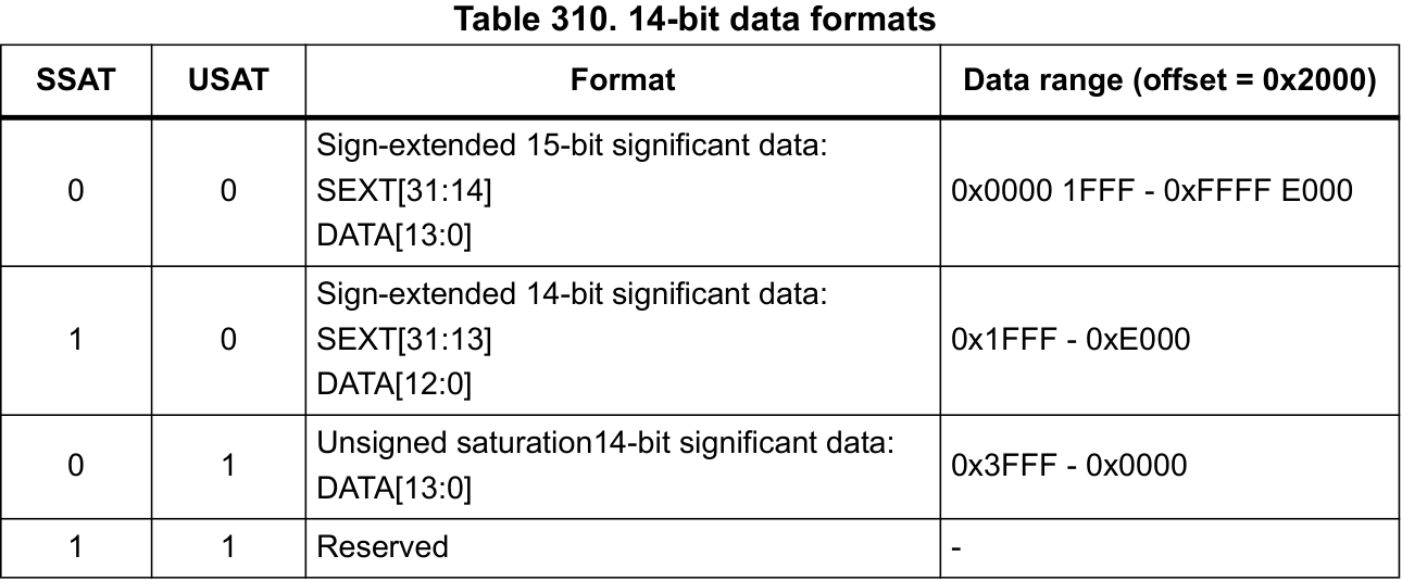 - 当VINP[i] = VREF+且VINN[i] = VREF-时,输出数据为0x3FFF