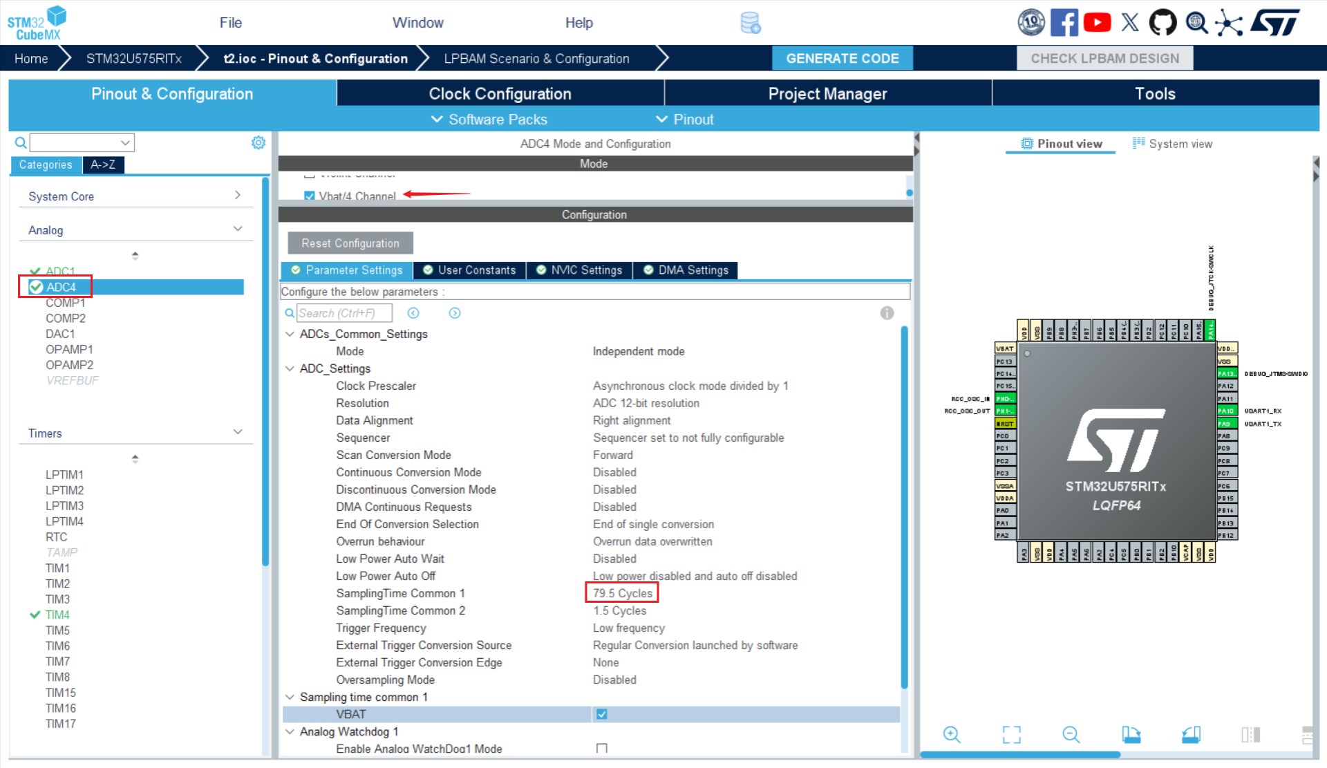 - ADC4测量VBAT的值,由软件触发,每1s,查询方法实现转换,完成后,计算VBAT电压,并打印结果