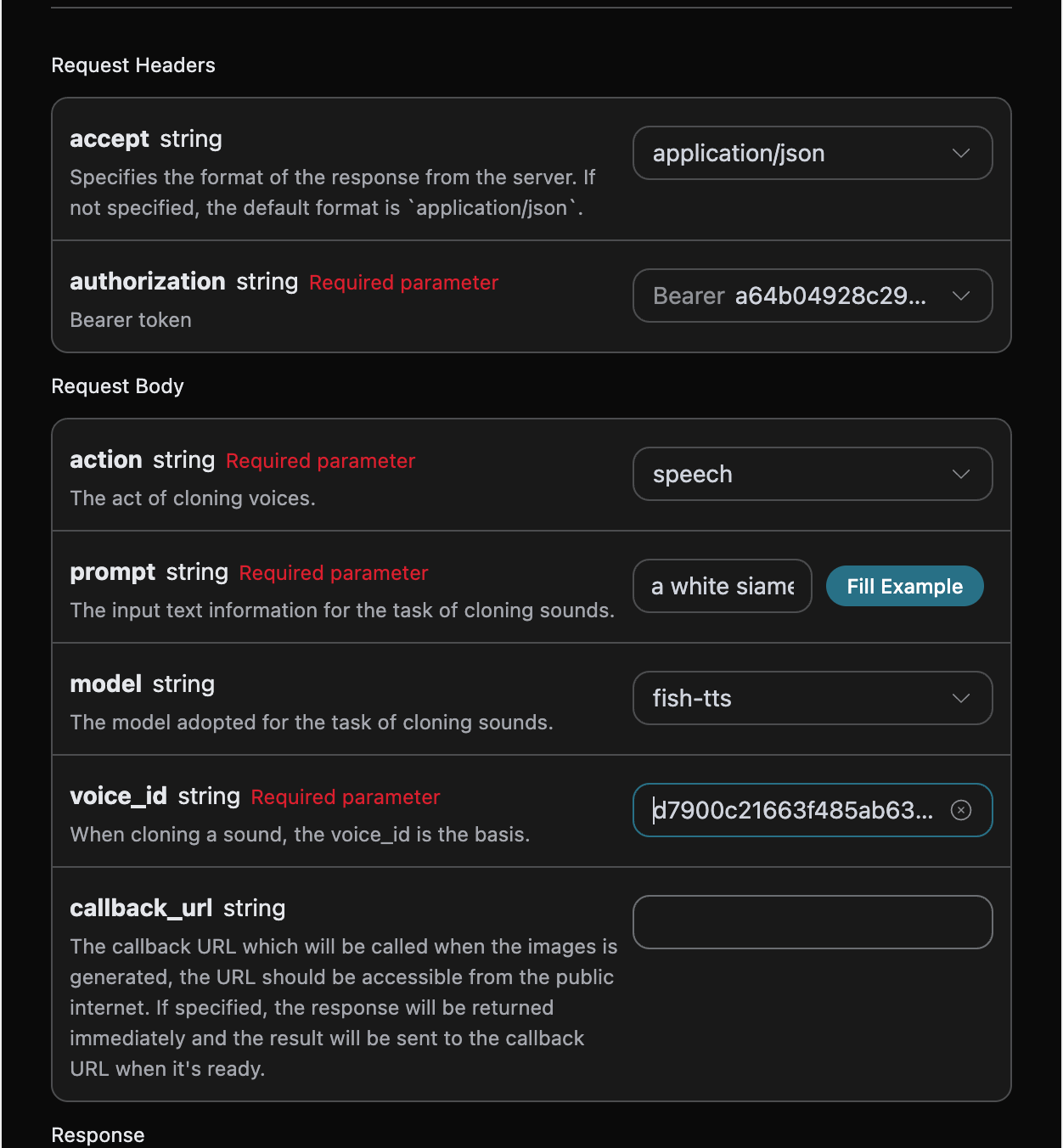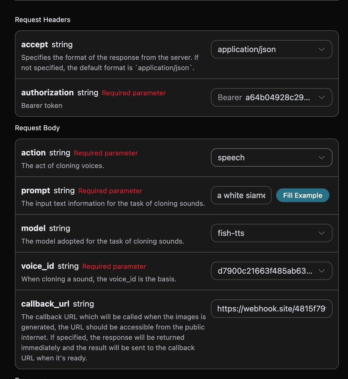 model:用于克隆声音的模型,主要是fish-tts。action:本次声音克隆任务的操作。prompt:需要克隆的提示词。voice_id:用于克隆的声音 ID。callback_url:接收回调结果的 URL。