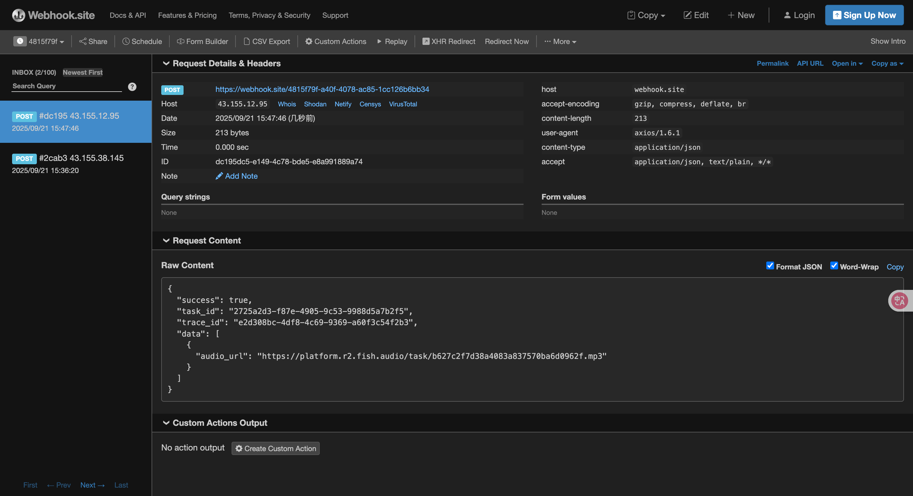 片刻之后,您可以在 https://webhook.site/4815f79f-a40f-4078-ac85-1cc126b6bb34 查看生成任务的结果,如下图所示: