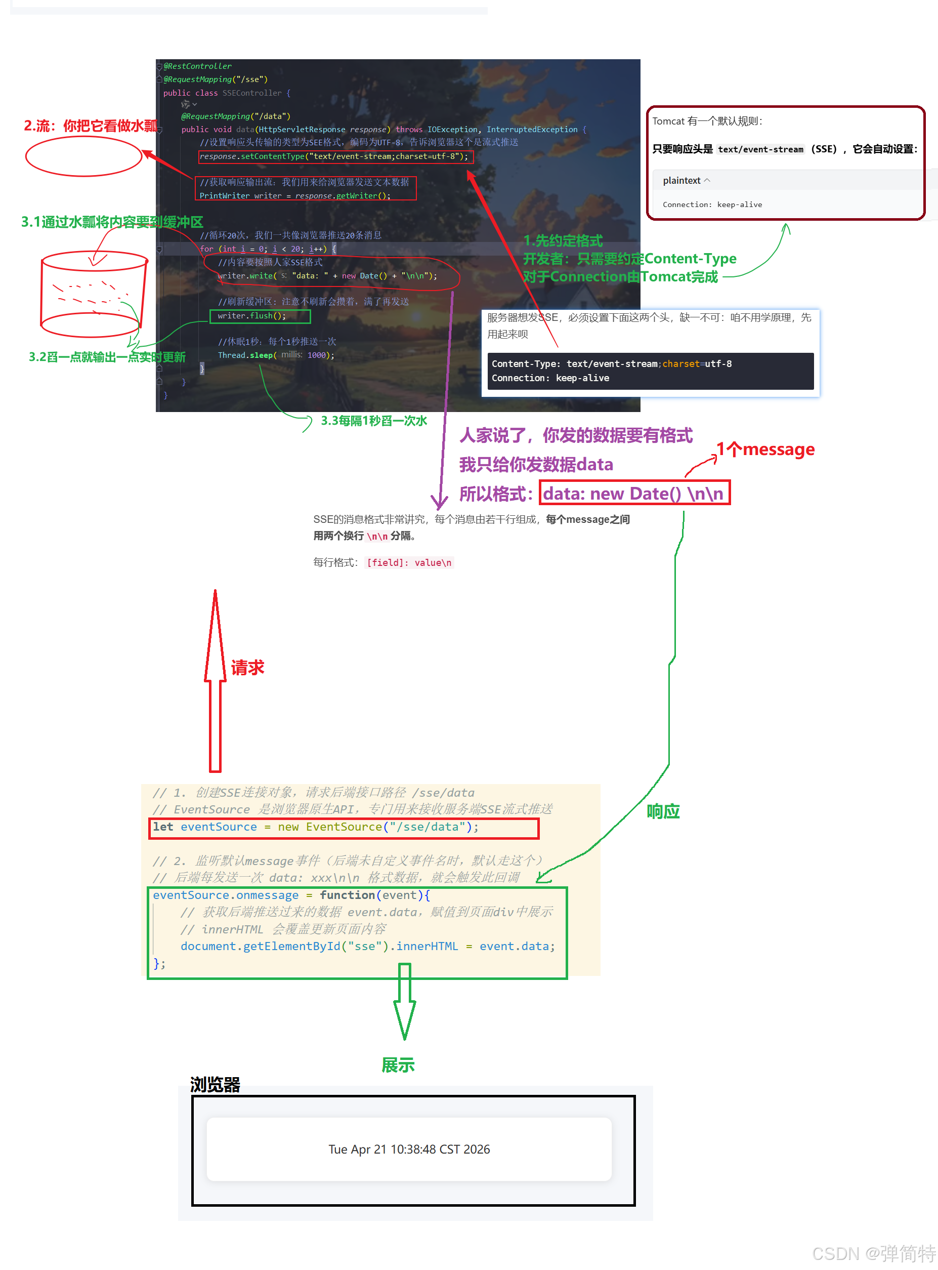 SSE的本质:服务器跟客户端打个招呼------"兄弟,接下来我要给你发流消息了,你连接别关啊,等着收菜就行!"