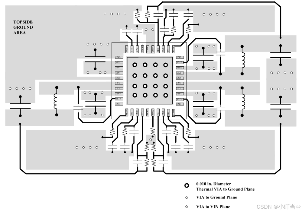 顶层大面积铺地,通过过孔连接内层地平面,重点在输入 / 输出电容下方与芯片散热焊盘处。
