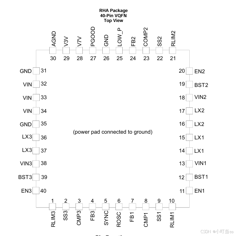 | EN3 | 40 | I | Buck3 使能引脚。低电平关断;悬空时内部弱上拉至 V3V,自动开启;如需延时启动,该引脚与地之间接小型陶瓷电容。 |