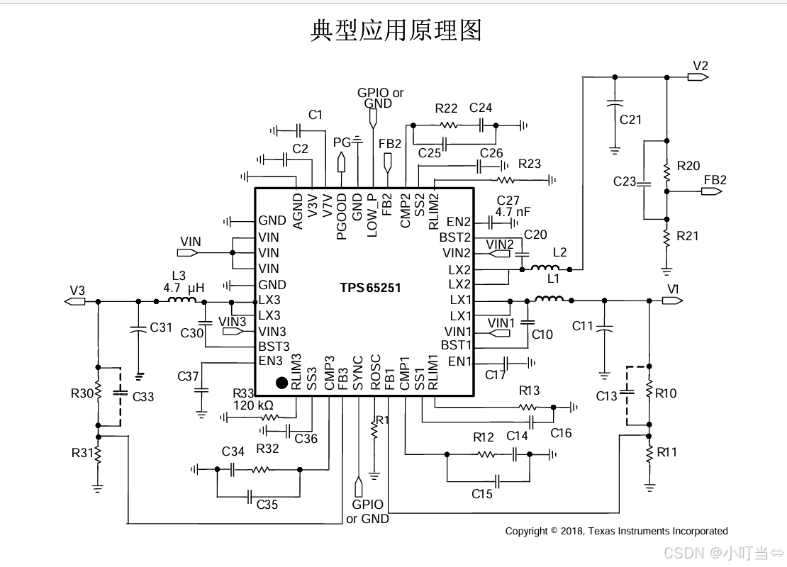 V7V、V3V:内部 LDO 输出,分别接 10µF、3.3~10µF 电容。