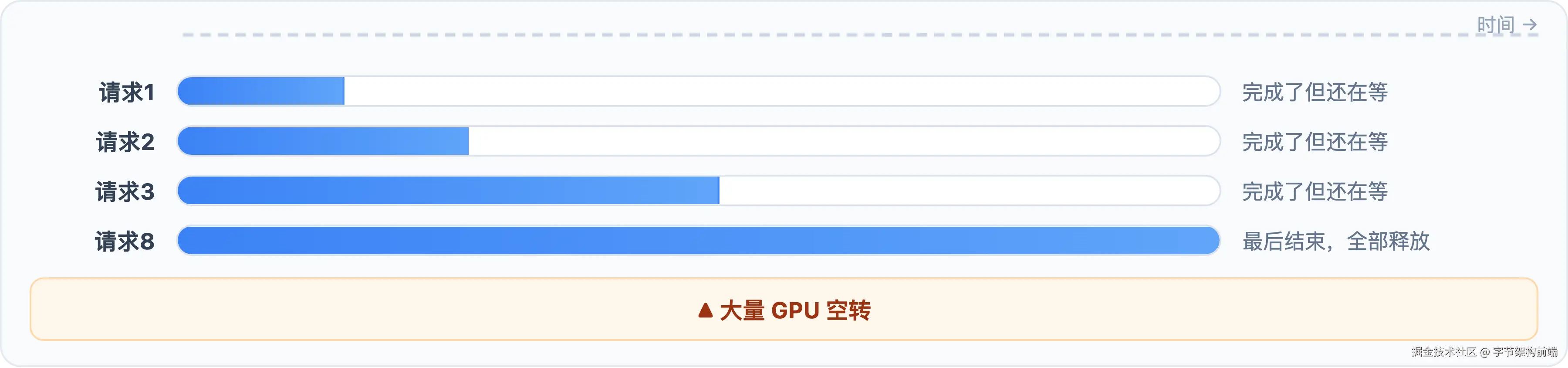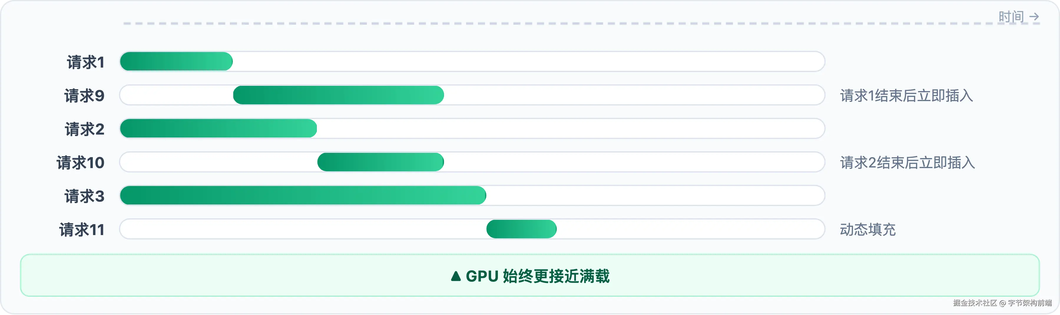 但最朴素的 Static Batching(把一批请求凑齐再一起跑)有个问题:所有请求必须同时开始、同时结束,短请求得陪长请求空转。
