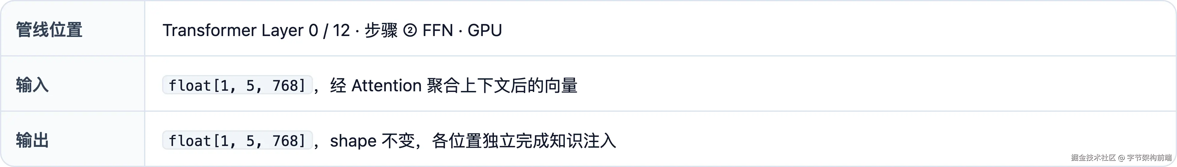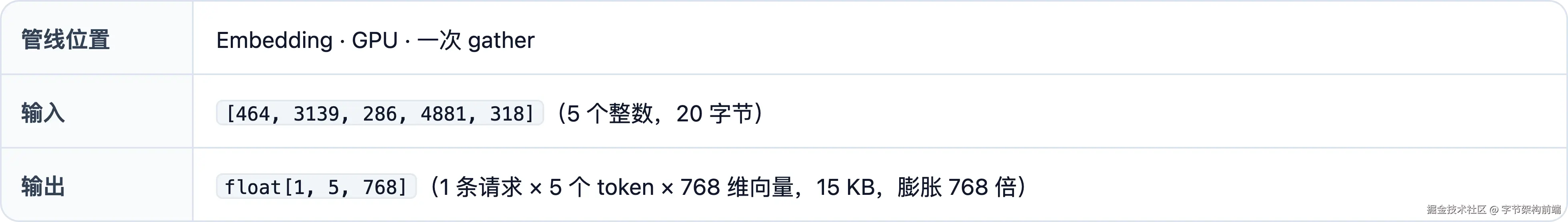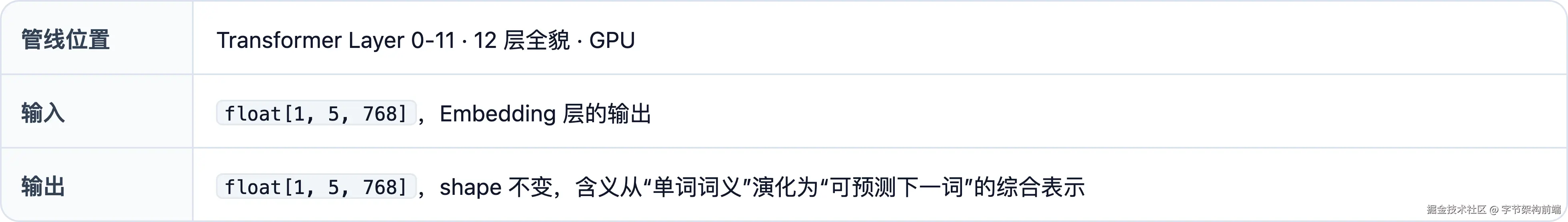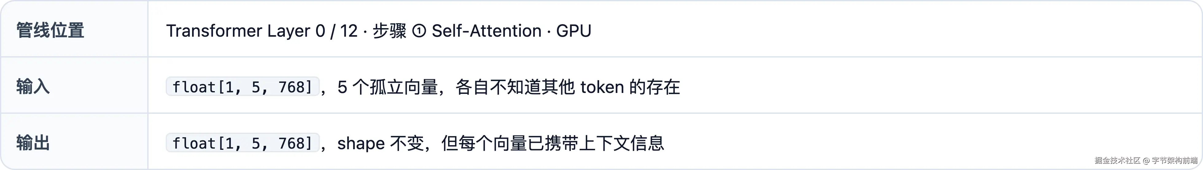 float[1, 5, 768]--- 多维数组的各维大小 。特征:数字小、有结构。三个维度含义:[batch_size, seq_len, hidden_dim],即 batch_size=1(单条请求)、seq_len=5(5 个 token)、hidden_dim=768(每个 token 的向量维度)。全文 batch_size 始终为 1。遇到歧义处会加标注。