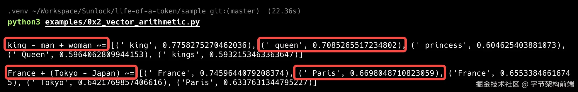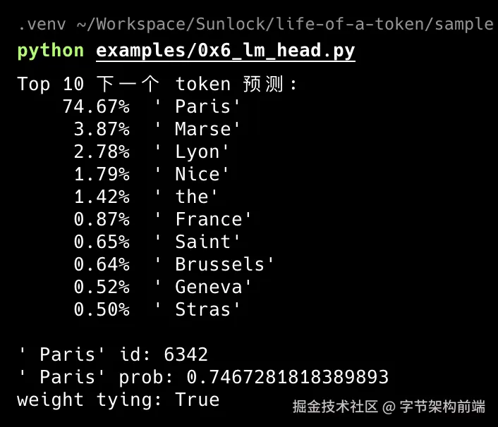 语义聚类。 排名 2--4 的 " Marse"(马赛)、" Lyon"(里昂)、" Nice"(尼斯)全是法国城市。高概率候选不是随机散落,而是形成了语义邻域:这印证了 Ch.3 Embedding 空间的结构:含义相近的 token,向量方向也相近,投影得分自然接近。