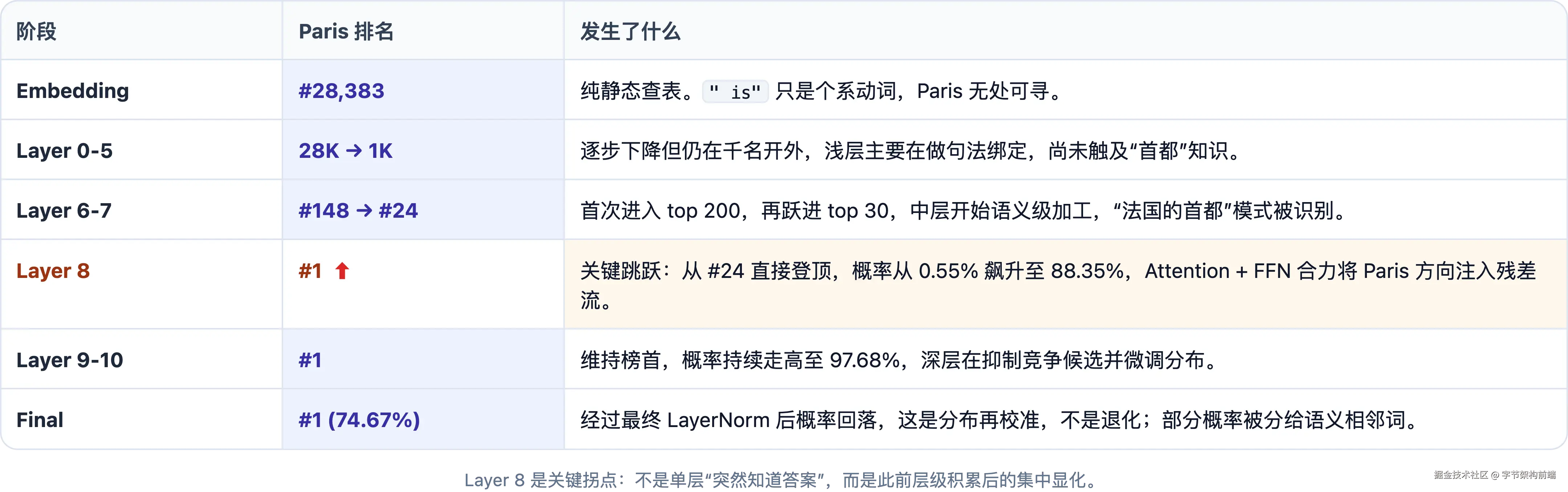 你一眼就知道答案:巴黎。读完 Ch.7,你会看到 " Paris" 以 74.67% 的概率断崖领先,模型仅凭矩阵乘法与非线性变换,逐层把这个答案算了出来。