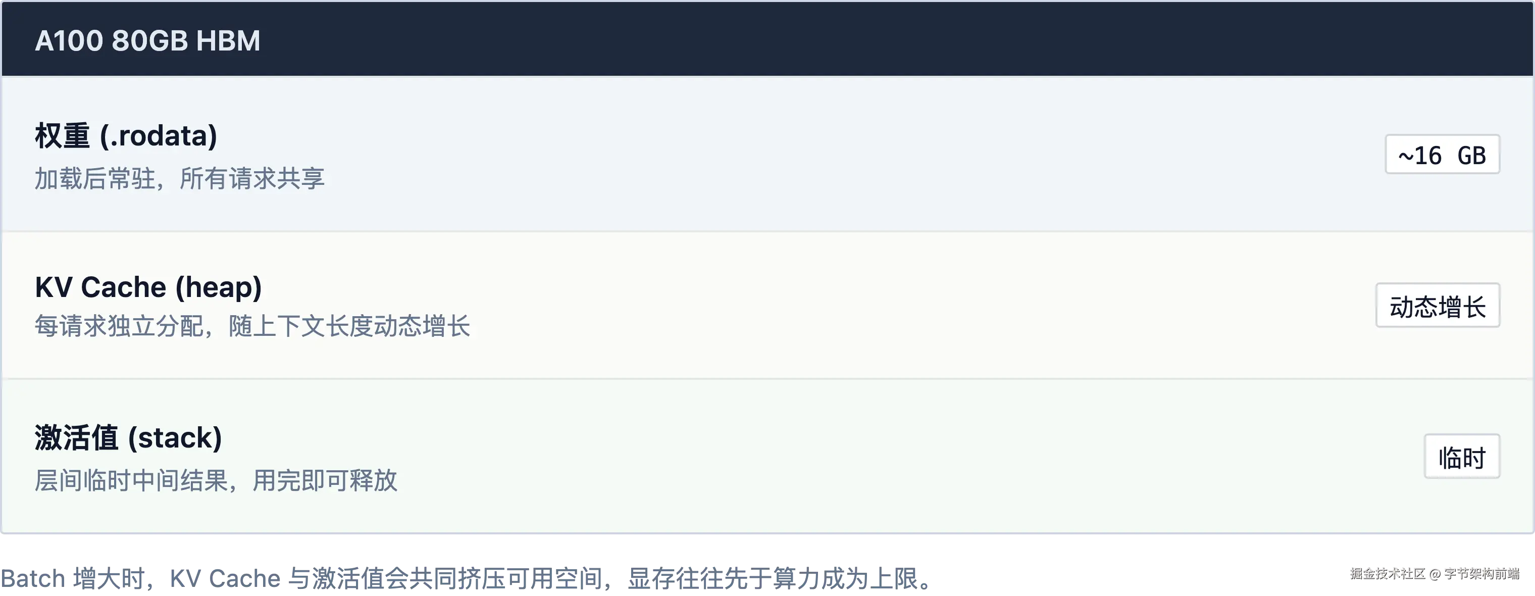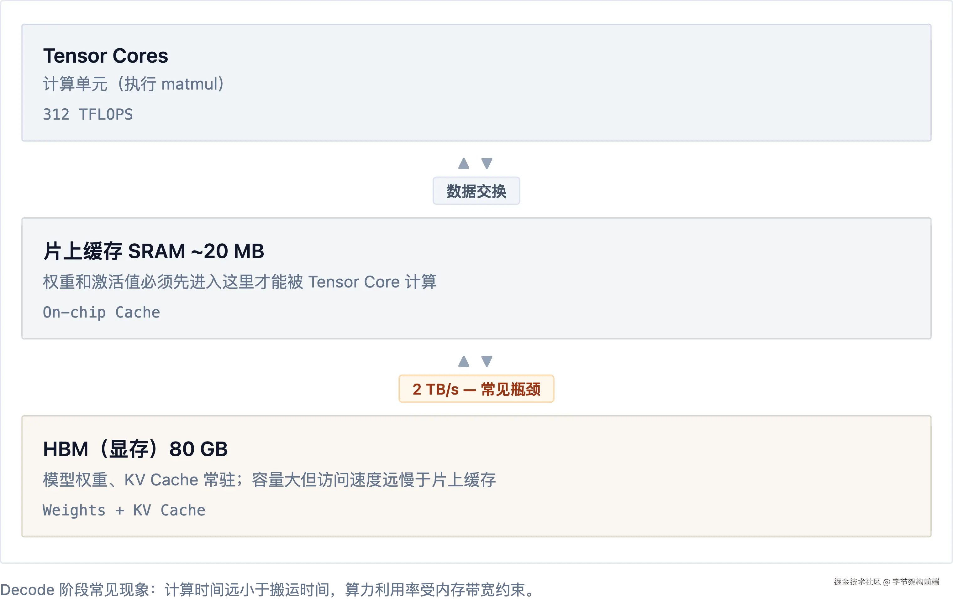 小结:Decode 阶段的核心矛盾:搬运慢、计算快。每生成一个 token 都要搬全部权重,99% 的时间 Tensor Core 在等数据。Batching 让搬来的权重被更多 token 复用,但 batch 不能无限大,80 GB 显存里权重、KV Cache、激活值三家挤着住,显存才是并发上限的硬约束。