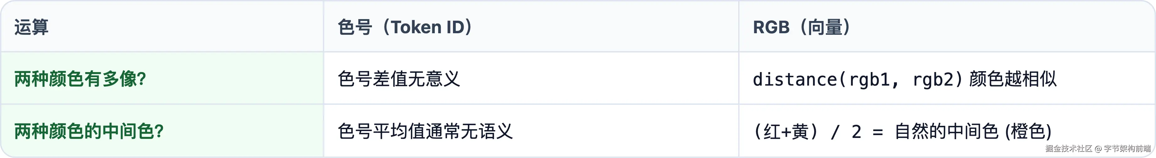 但 RGB 不同:(255, 0, 0) 是红,(0, 0, 255) 是蓝。现在你可以算距离、做混色、判断相似度,因为每个分量都有意义(红绿蓝三个通道的亮度),它们构成一个可计算的向量空间。