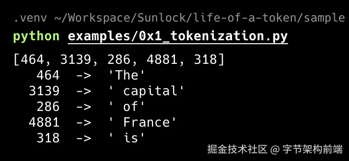5 个 token,5 个整数。注意 " capital" 的前导空格:BPE 把空格编码为 token 的一部分,让模型能区分词首与词中。