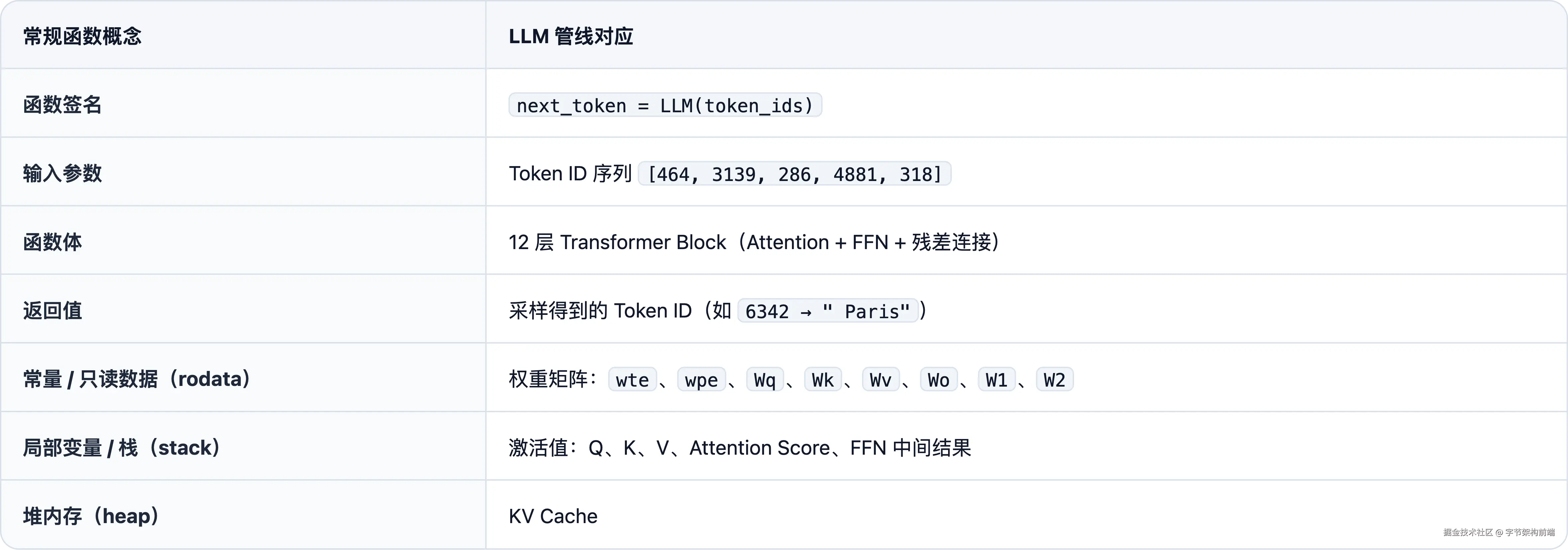 整条管线可以看作一个跑在 GPU 上的程序:权重加载后常驻显存,只读不改,类似进程里的 .rodata 段;每次推理就是一次函数调用,输入是 token 序列,输出是下一个 token 的概率分布。