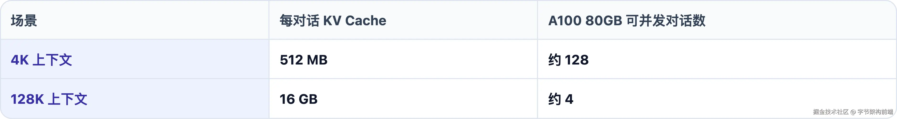 128K 上下文时一张 A100 只能并发约 4 个对话,容量规划的瓶颈从 QPS 变成了"并发对话数 × 上下文长度"。由此催生 PagedAttention、KV Cache 量化、GQA/MQA 等优化。