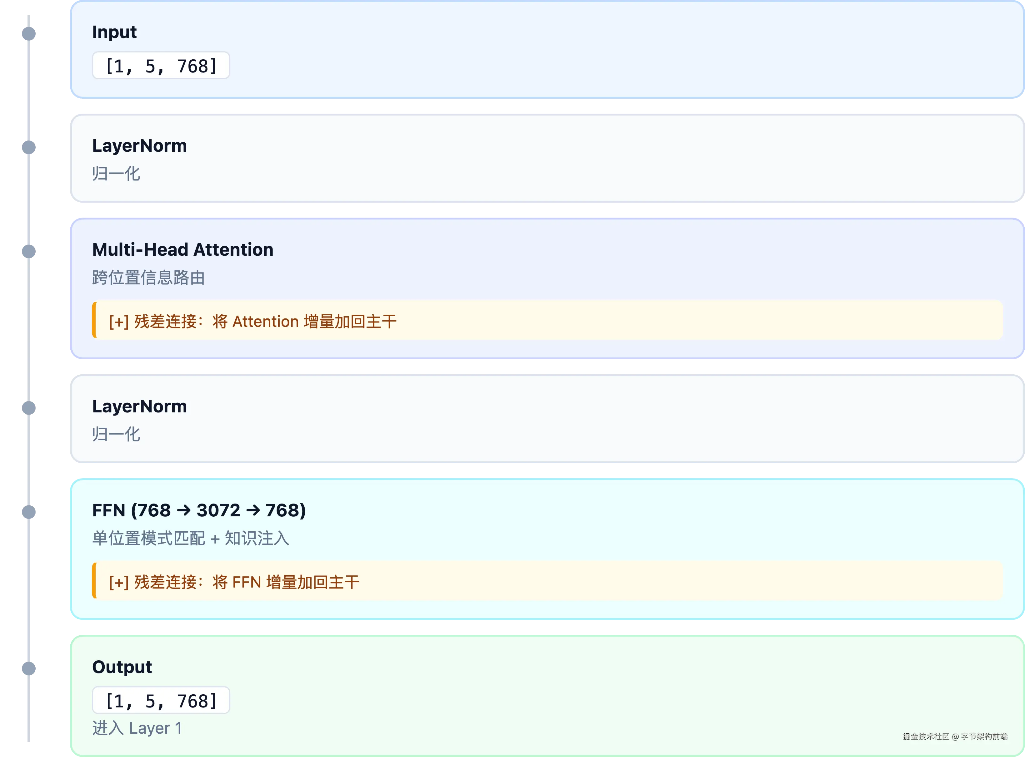 这篇文章沿着这条管线,带你走完一个 token 从输入到输出的每一步。内容对非算法同学友好。