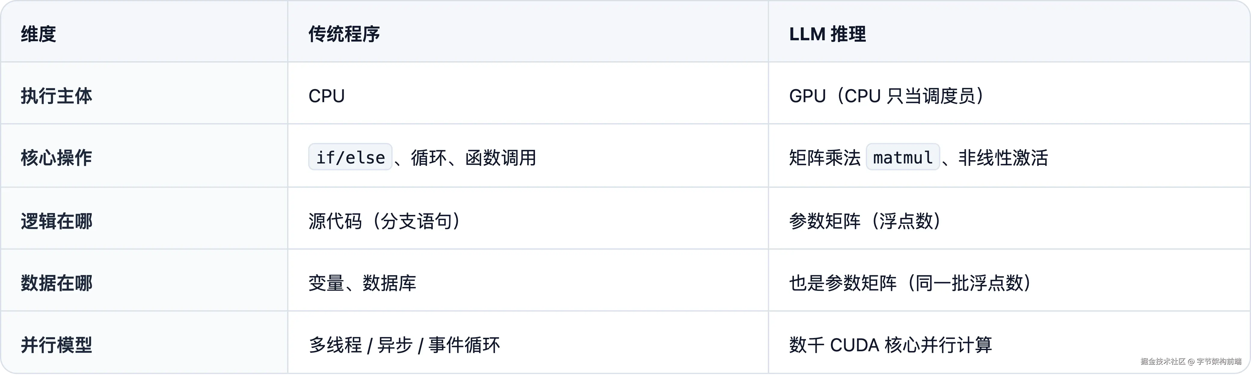 Pixel 和 Token 最终都落在同一块芯片上:GPU。渲染管线里它把顶点变成像素,LLM 管线里它把浮点变成下一个 token。同一块硬件,同一种矩阵乘法,产出截然不同的东西:一个是你看见的画面,一个是你读到的文字。