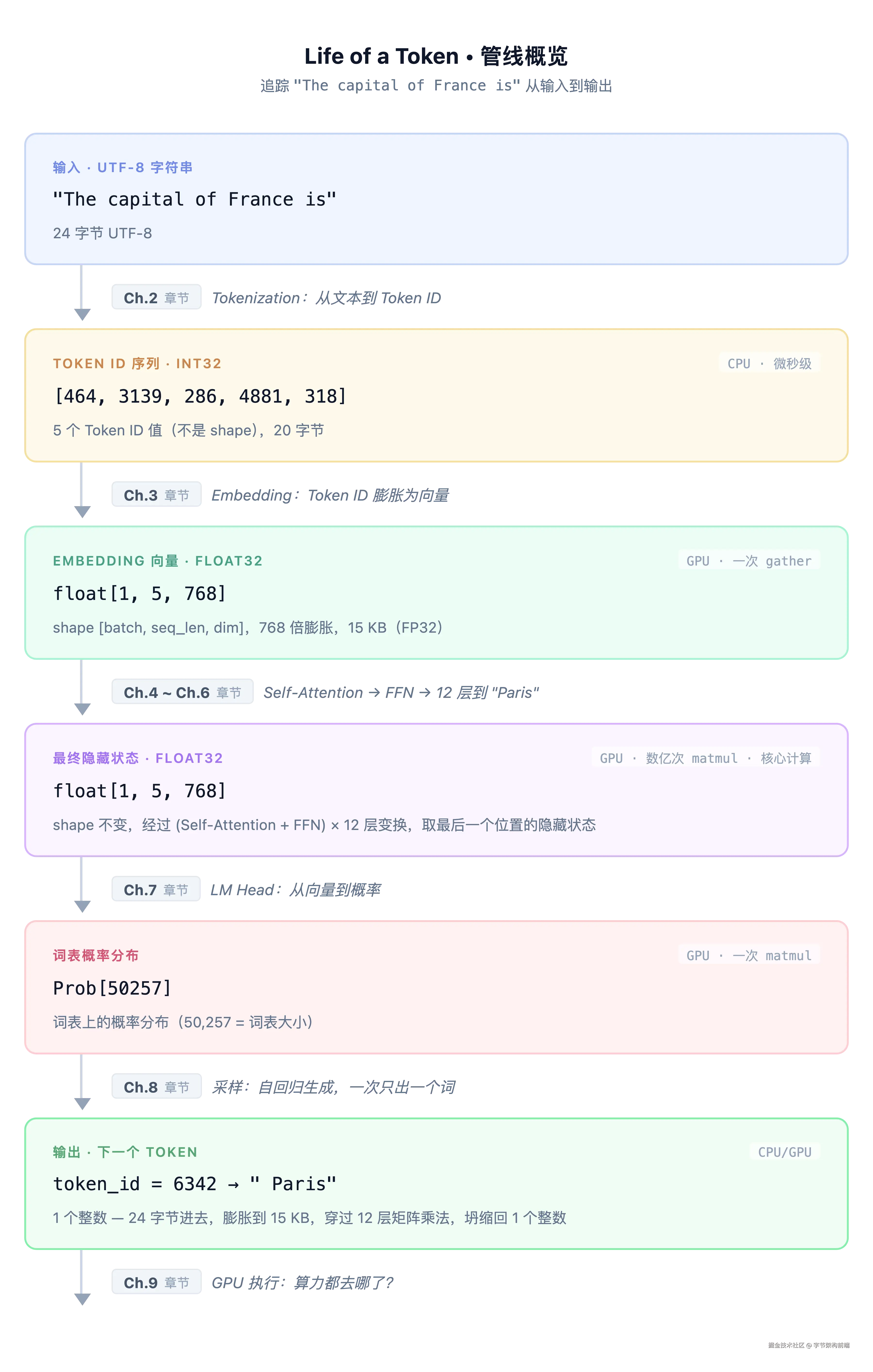 开篇借了 Chrome 团队的比喻:追踪一个像素走完渲染管线的旅程。现在,这枚 token 也走完了它的一生:字符串 → 整数 → 向量 → 12 层变换 → 概率分布 → 采样 → " Paris"。