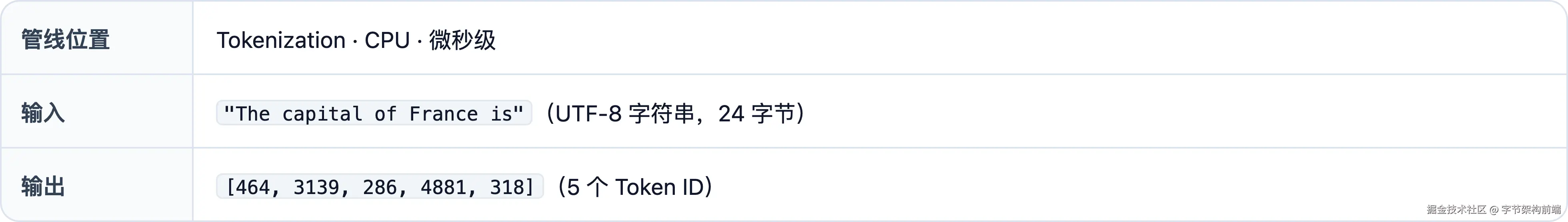 小结:Tokenization 把 GPU 看不懂的字符串变成它能处理的整数序列。BPE 词表是冻结的 HashMap,推理时纯查表。