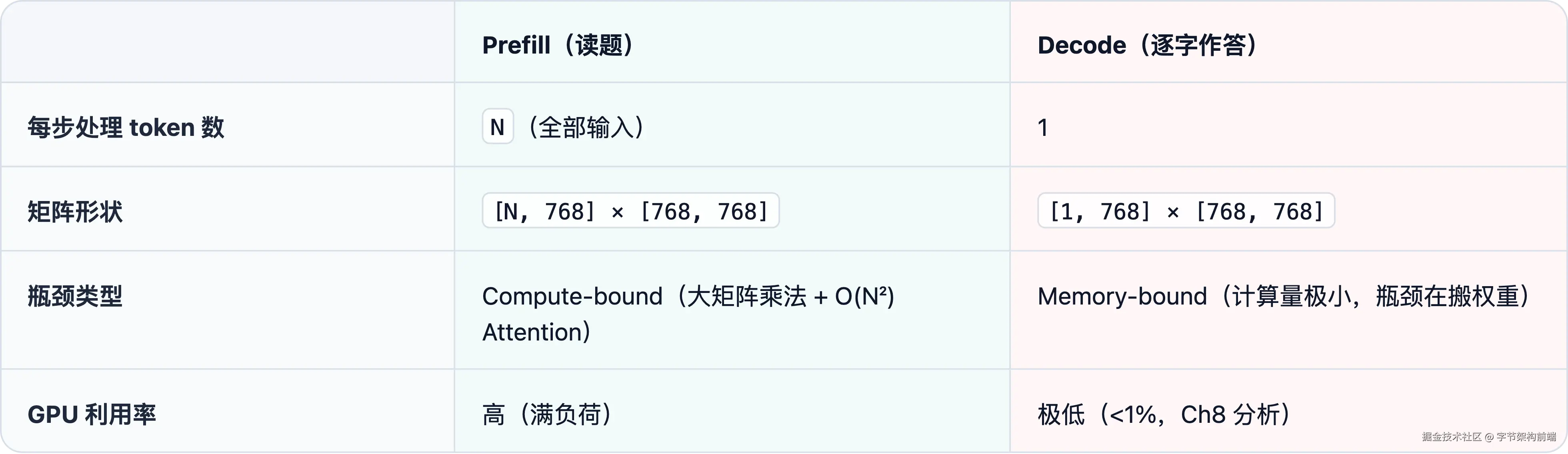 生成必须逐个进行,但输入可以一次性并行处理,这一区别把 LLM 推理划分为两个阶段: