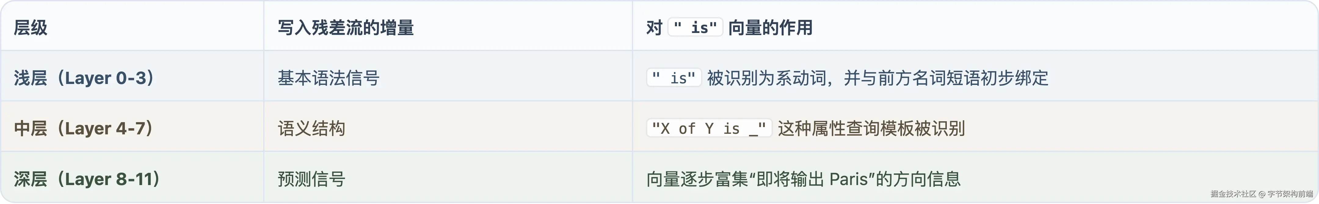 king - man + woman ≈ queen 不是巧合,训练压力把同类关系编码为平行的向量位移。"巴黎是法国首都"不占某个参数的某一位,而是一个几何性质:向量经过 12 层变换后,残差流的叠加结果恰好落在 " Paris" 附近。这个结构不是设计出来的,是数十亿句子的统计压力压出来的。