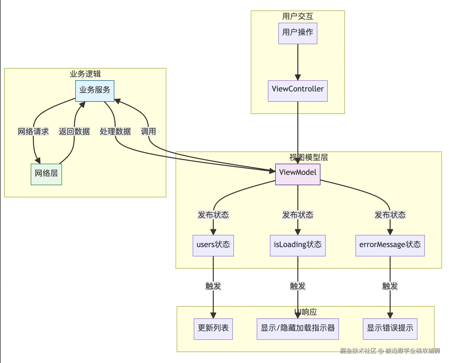 下图展示了声明式数据流在MVVM架构中的完整工作流程,从用户交互到网络请求,再到UI更新的完整闭环: