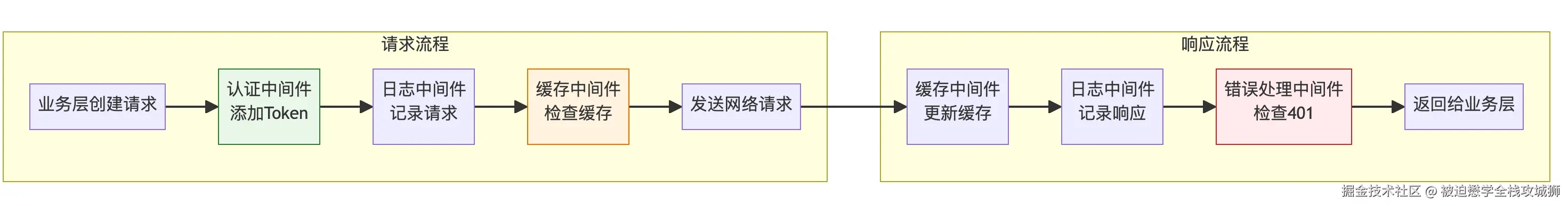 通过串联多个中间件,我们可以形成灵活的处理管道。例如,认证中间件自动为需要认证的请求添加Token,错误处理中间件检查401状态码并触发Token刷新流程。这种设计使得横切逻辑模块化且可插拔,极大提升了代码的可维护性和可测试性。