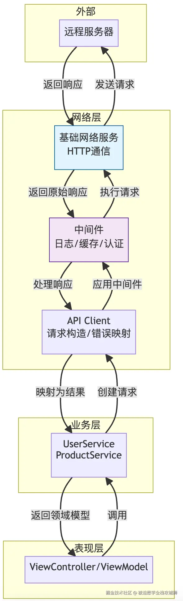 解决上述问题的第一步是分离关注点。我们应构建一个独立的基础网络层,其核心职责是接收请求配置,发起网络调用,并返回标准化响应。下图展示了分层网络架构中各层的职责与数据流向: