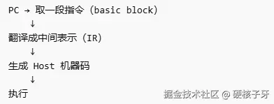 这里只是举个例子,qemu内部实际使用的是性能更高的解决方案:TCG,这个技术有点类似Java虚拟机JVM的模板解释器或即时编译JIT,上面的伪代码类似JVM的字节码解释器