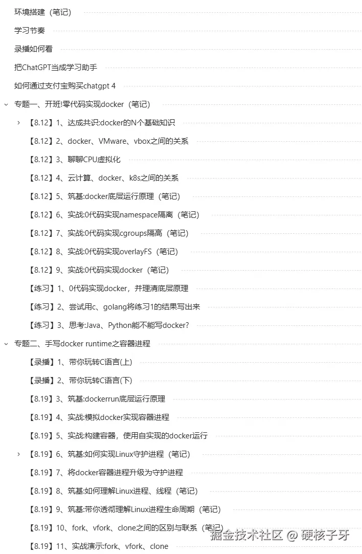 docker是如何实现的呢?基于Linux内核提供的namespace+cgroups+overlayfs实现的。细节不展开了,如果你想深入学习,我之前做过课程《手写docker》