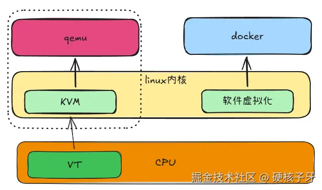 CPU虚拟化技术,是一种硬件虚拟化技术,又名vt。qemu加参数-enable-kvm就是基于硬件虚拟化技术运行,kvm又是什么呢?kvm与vt是什么关系呢?docker与它们又有什么区别呢?