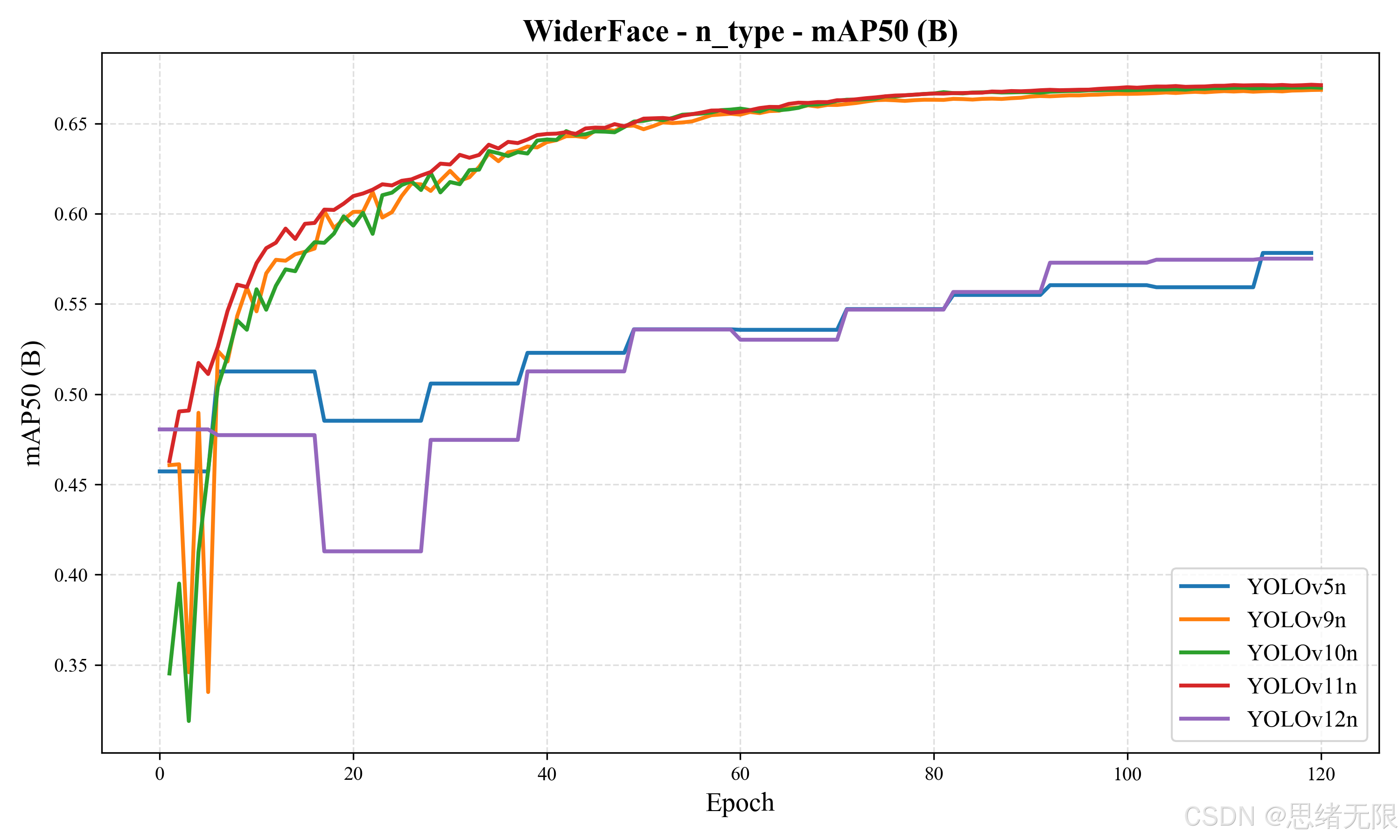 进一步从训练过程观察,YOLOv9n/YOLOv10n/YOLOv11n 的 m A P 50 ( B ) mAP50(B) mAP50(B) 在前 20--30 个 epoch 内快速上升,随后进入缓慢爬升并在约 0.67 附近收敛,体现出优化过程稳定、增益主要来自后期对难例的渐进拟合。相对地,图中 YOLOv5n 与 YOLOv12n 的曲线末端明显低于 0.60(此处仅依据曲线读数作近似判断),并呈现阶梯式上升,通常意味着当前超参数配置对该版本并不匹配(例如学习率、正负样本分配或增强强度导致的收敛效率下降)。对工程实现而言,这一现象的直接含义是:在不做额外调参的前提下,YOLOv9--YOLOv11 的"开箱可用性"更强,而 YOLOv12n 若要发挥潜力,往往需要围绕注意力模块的训练稳定性重新校准学习率与增强策略。