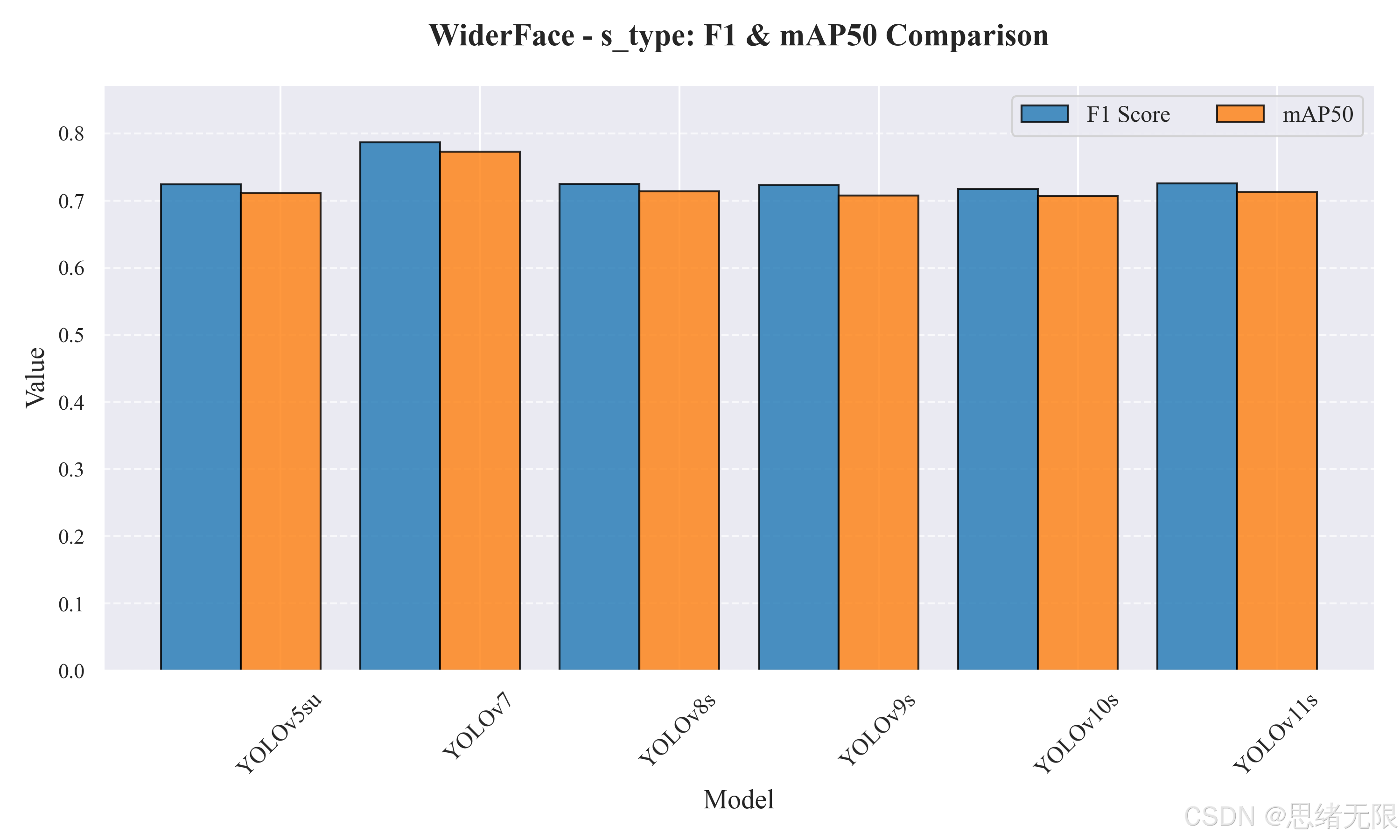 在 s 级模型 对比中,展示了 F 1 F1 F1 与 m A P 50 mAP50 mAP50 的柱状对比结果,YOLOv7 在该组取得显著更高的精度( F 1 ≈ 0.787 , , m A P 50 ≈ 0.773 F1\approx0.787,,mAP50\approx0.773 F1≈0.787,,mAP50≈0.773),表现出"更大容量模型"对困难样本的收益;但这类收益伴随更高的计算与时延成本,因此是否采用需要结合实时性约束综合判断。