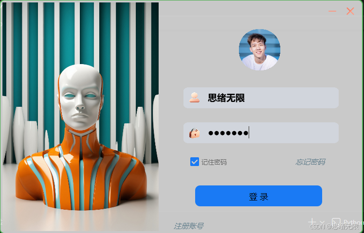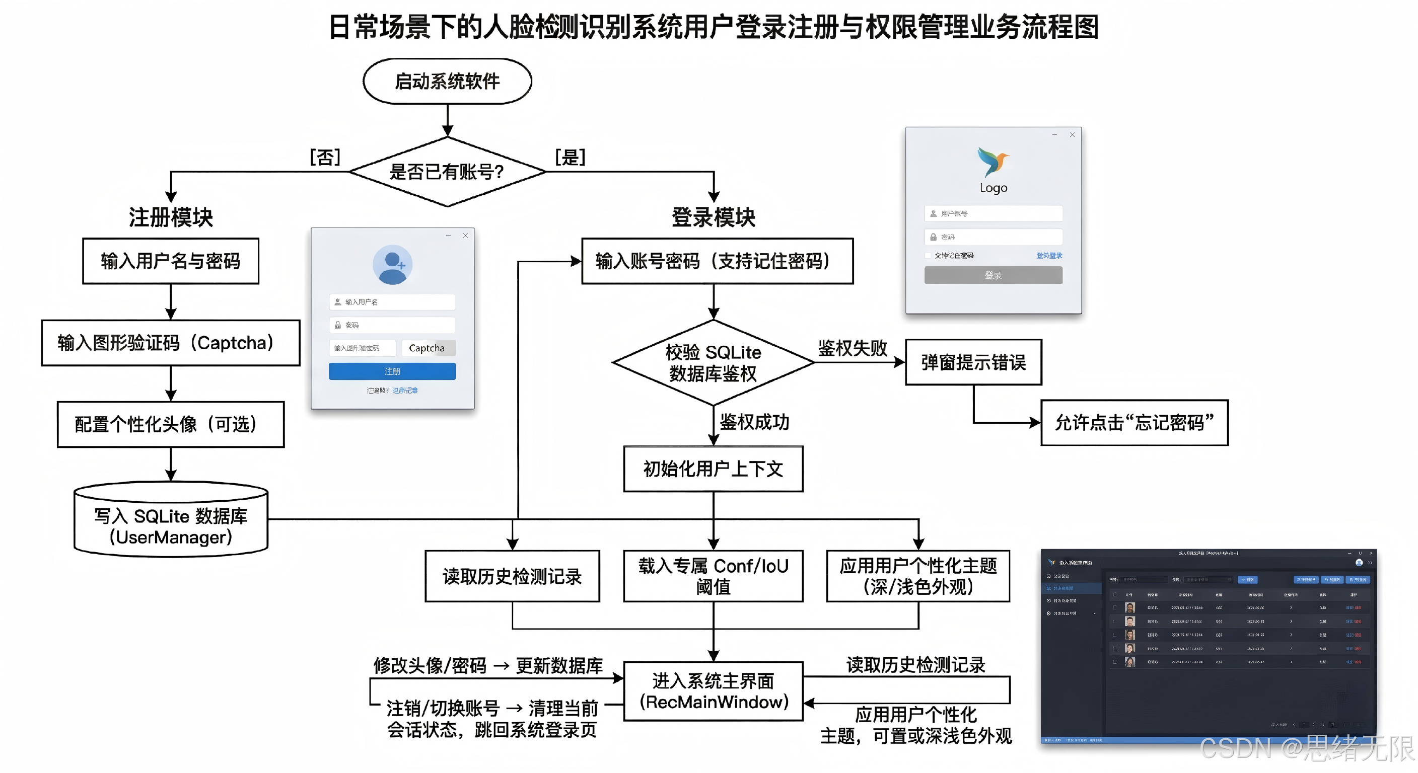 登录与账户管理被设计为主检测流程之前的"个性化入口":用户在登录页完成注册或身份校验后,系统立即从 SQLite 载入其模型偏好、Conf/IoU 阈值、主题外观与历史检测记录,并据此初始化主界面状态,使同一程序在不同使用者间天然隔离配置与结果空间;在主界面内,头像与密码修改通过数据库写回实现长期有效的身份维护,注销/切换账号则触发清理当前会话状态并回到登录页,从而把账户体系与推理线程、结果保存、主题呈现等模块稳定衔接,保证交互一致性与数据持久化的可追溯性。