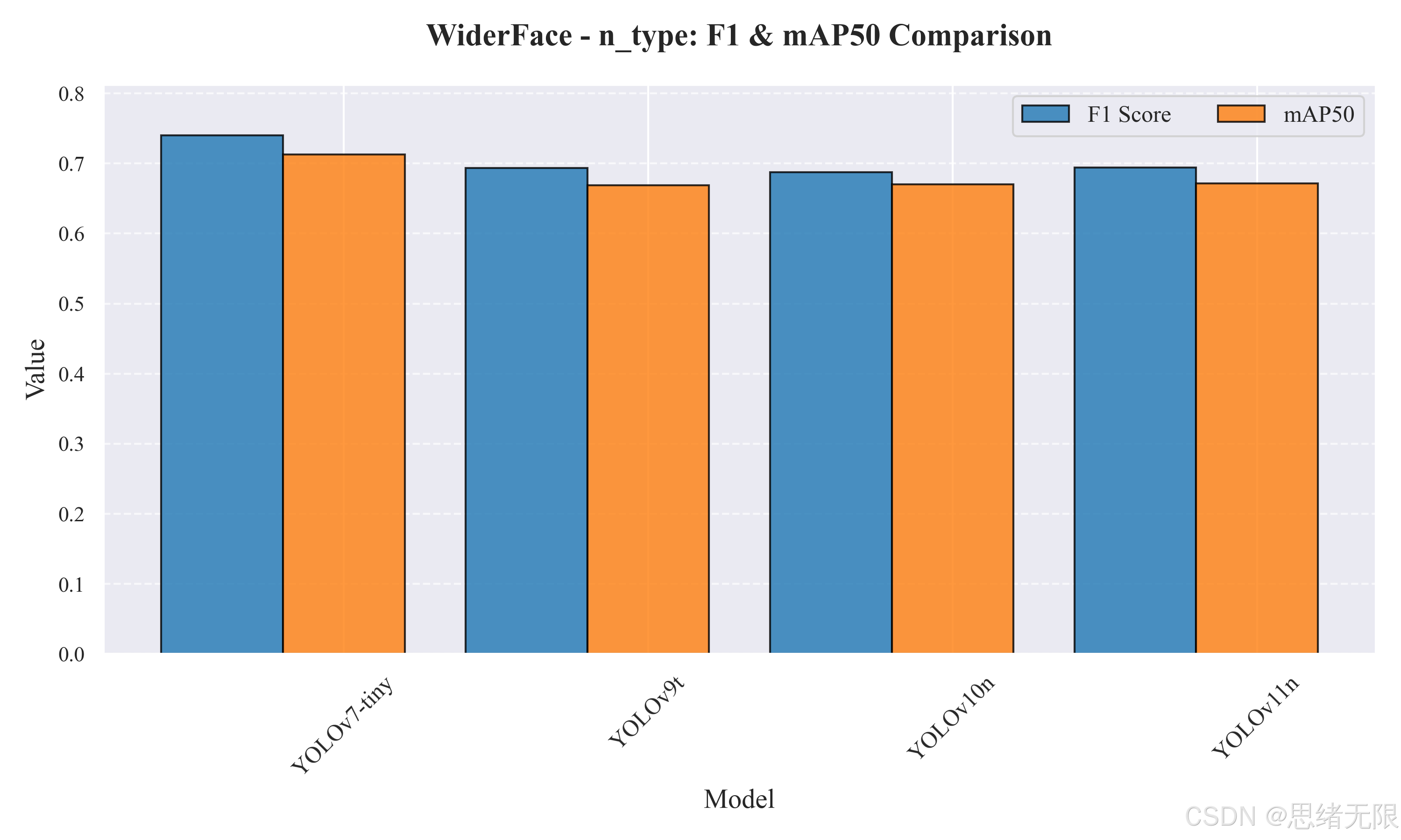 在 n/t 级轻量模型 对比中,图5-1给出了不同模型的 F 1 F1 F1 与 m A P 50 mAP50 mAP50 柱状对比,可以直观看到 YOLOv7-tiny 在该组中取得更高的综合检测性能,而 YOLOv9t/YOLOv10n/YOLOv11n 的 m A P 50 mAP50 mAP50 集中在 0.669--0.671 区间,差异较小但推理效率差异明显。