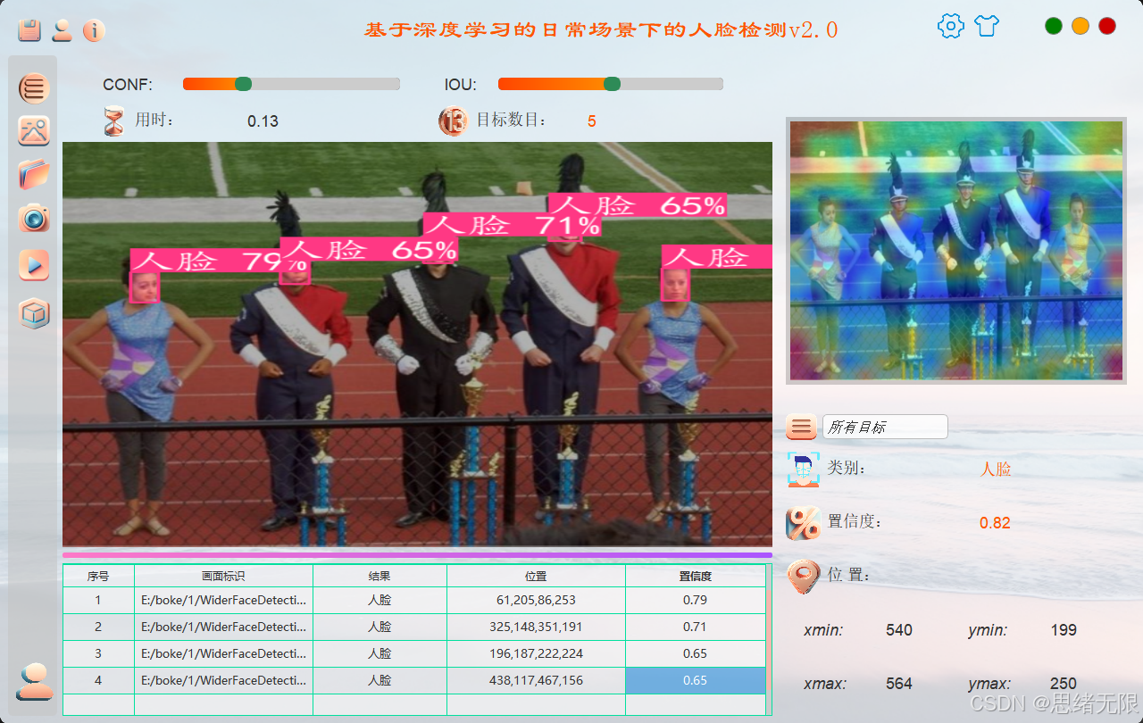 摘要 :面向门禁考勤、相册整理与人机交互等应用中的日常场景人脸检测 需求,本文给出一个从算法对比到桌面端落地的完整实现。系统以 YOLOv5--YOLOv12 为核心检测骨干,梳理各版本在骨干网络、特征金字塔、检测头与训练配置上的关键演进,并在自建与清洗的人脸数据集 上进行统一训练与评测,给出 mAP、F1、速度、参数量及 PR/训练曲线等可复现实验结果。工程侧基于 Python 3.12 与 PySide6 构建可交互界面,通过 Qt 信号槽与多线程推理实现图片/视频/摄像头输入、Conf/IoU 动态调节、检测框与置信度可视化、批量统计、结果保存与导出,并可选配 SQLite 账户与历史记录管理。文末提供完整代码、界面工程与数据集资源包,便于复现与二次开发。