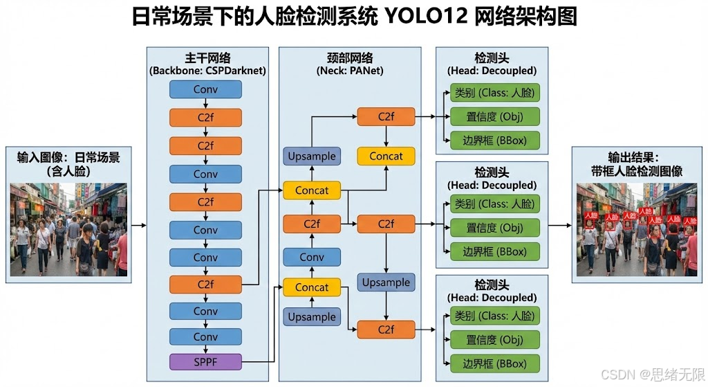 从网络结构角度看,本文采用的检测器可以概括为"骨干网络---特征融合颈部---检测头"的三段式拓扑。骨干侧负责从输入图像提取分层语义特征;在 YOLOv12 中,注意力模块不再采用复杂窗口划分,而是以等分区域的方式在水平或垂直方向重排特征,从而在计算复杂度与有效感受野之间取得折中;同时以带缩放的残差聚合结构(R-ELAN)改善深层优化稳定性,并配合较大的可分离卷积作为位置感知器,弥补去除显式位置编码后的空间信息表达。(ar5iv) 颈部结构延续 YOLO 系列常用的多尺度特征融合思想,通过自顶向下与自底向上的路径把高层语义与低层细节对齐,使检测头在多分辨率特征图上同时预测,从而缓解小人脸在下采样过程中的信息损失。检测头在工程实现上以"分类---回归"解耦为主(不同版本细节略有差异),最终输出每个候选位置的人脸置信度与边界框回归量;对于本文的单类任务,类别空间退化为一维,有利于把模型容量更多用于定位质量与困难样本表征。
