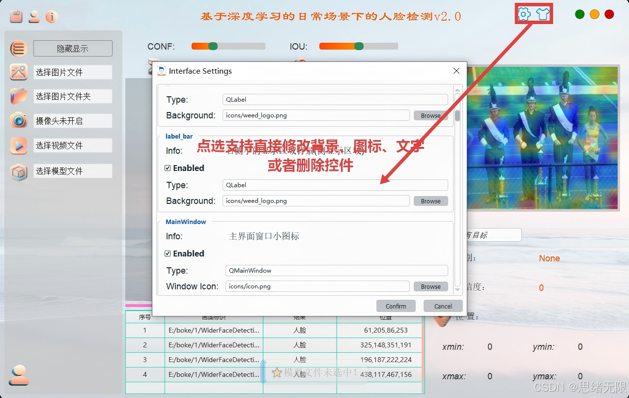 (2)多源输入与实时检测:支持摄像头、视频、单图、图片文件夹;实时绘制检测框与置信度,阈值(Conf/IoU)可随时调节并即时生效。