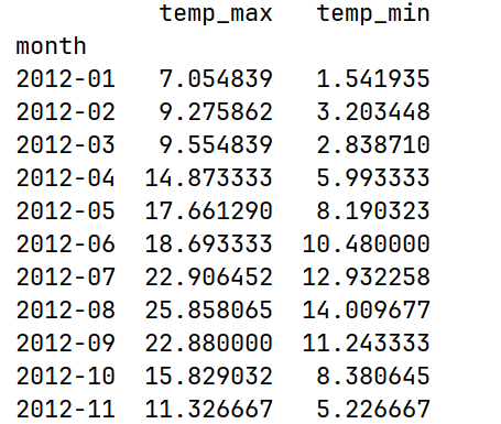 temp = groupby_month[["temp_max", "temp_min"]] # 从分组对象中选择特定的列