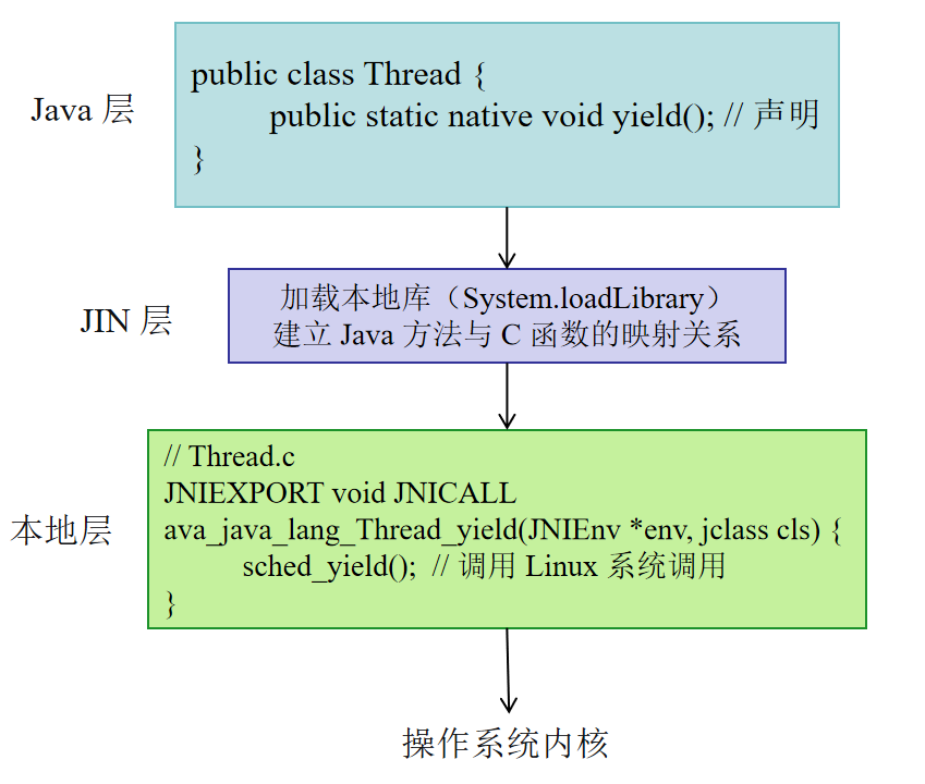 - 调用执行:Java 调用 native 方法时,JVM 根据映射关系找到对应的 C 函数并执行。