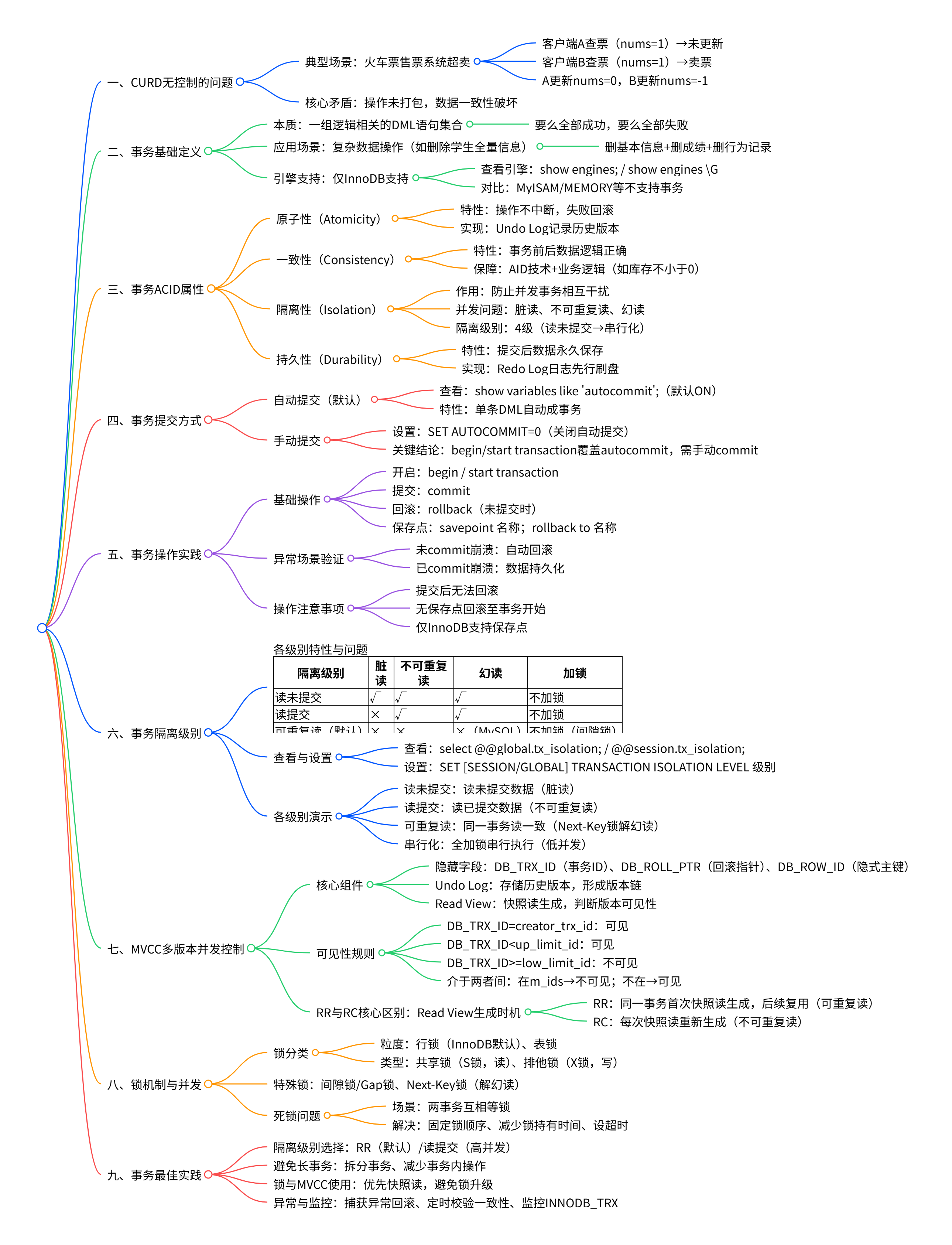 从火车票超卖问题到银行转账的安全性,从 ACID 属性到 MVCC 的底层实现,MySQL 事务始终围绕一个核心目标 ------保证数据在并发场景下的一致性。